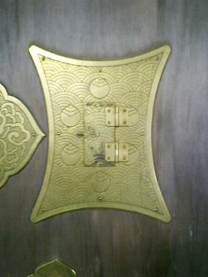 これは別宮などの扉を装飾してる大きな鋲があり、これらをデザインして今回の意匠に仕立てています。意匠とは、表現